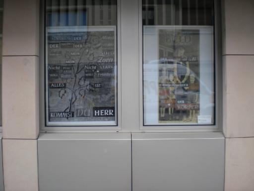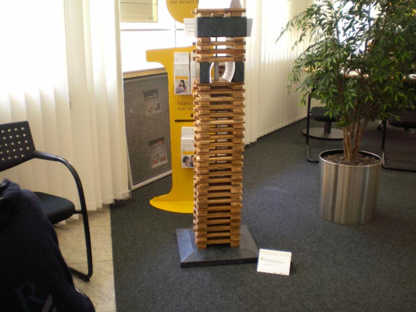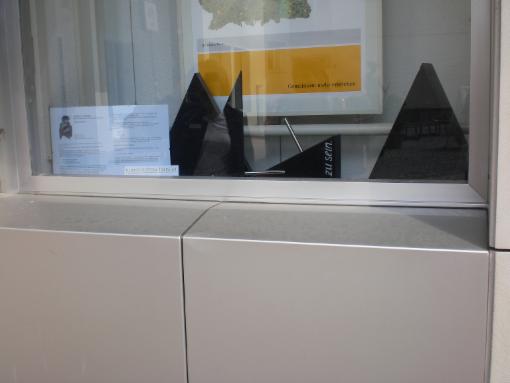 spurenlegen war wieder in der Bank; ein großformatiges Poster (Alles Du) und eine Stele ( Fragiles Gleichgewicht) aus Holz, Diabas, Messing und Papier befanden sich im Innenraum der Bank und konnten nur zu den Öffnungszeiten gesehen werden. Oben ein Eindruck von beidem.